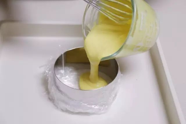 ⑧把黄色芒果慕斯液倒入慕斯圈中,放入冰箱冷冻1个半小时