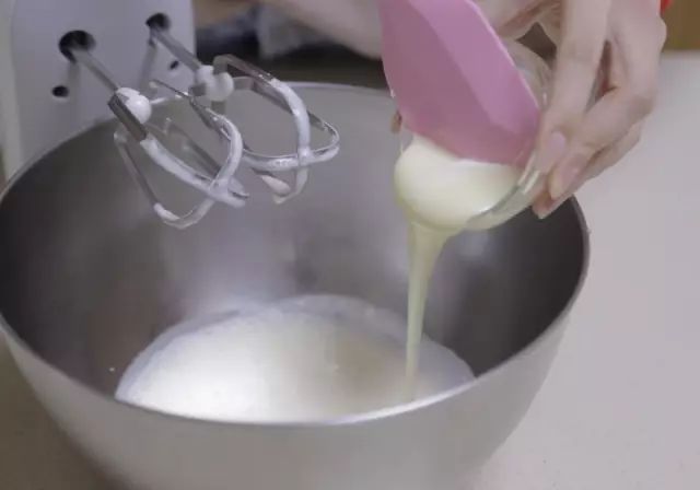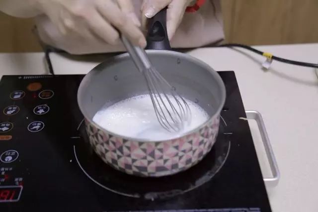 ②牛奶和糖、香草精混合加热到68度以上,冲入蛋黄中,边冲边搅拌成混合液体
