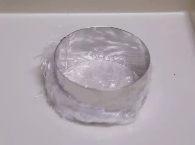 ⑦慕斯圈用2-3层保鲜膜裹住底部放在烤盘上