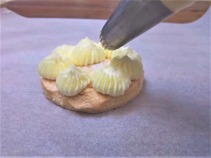 组装:⑨将淡奶油加入糖粉,打至6-7分发,填入装好花嘴的裱花袋(图中使用16齿花嘴)