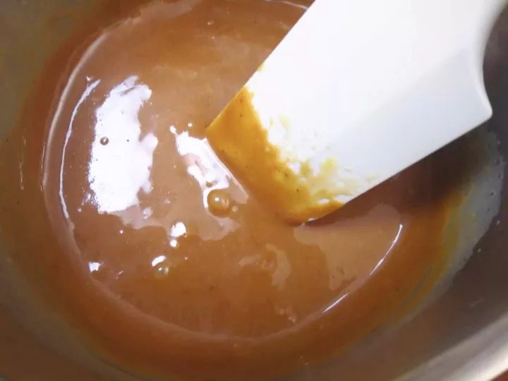 ⑦细砂糖加水,煮至出现焦糖色泽、闻到焦糖香气,马上倒入温热的淡奶油搅匀,续煮至浓稠但仍保留较好流动性的状态(需注意的是,如果煮太久,焦糖会凝固得比较快,不利后续组装哦~)。