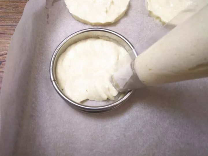 ③将面糊填入装好裱花嘴的裱花袋(边缘平滑无齿的花嘴皆可),取圆形模具放置烤盘上,在模具底部均匀挤出一层约5mm厚度的面糊,然后垂直拿起模具,让圆饼形状自然形成(本分量大约可做7个小饼,每2片组成一个成品)。