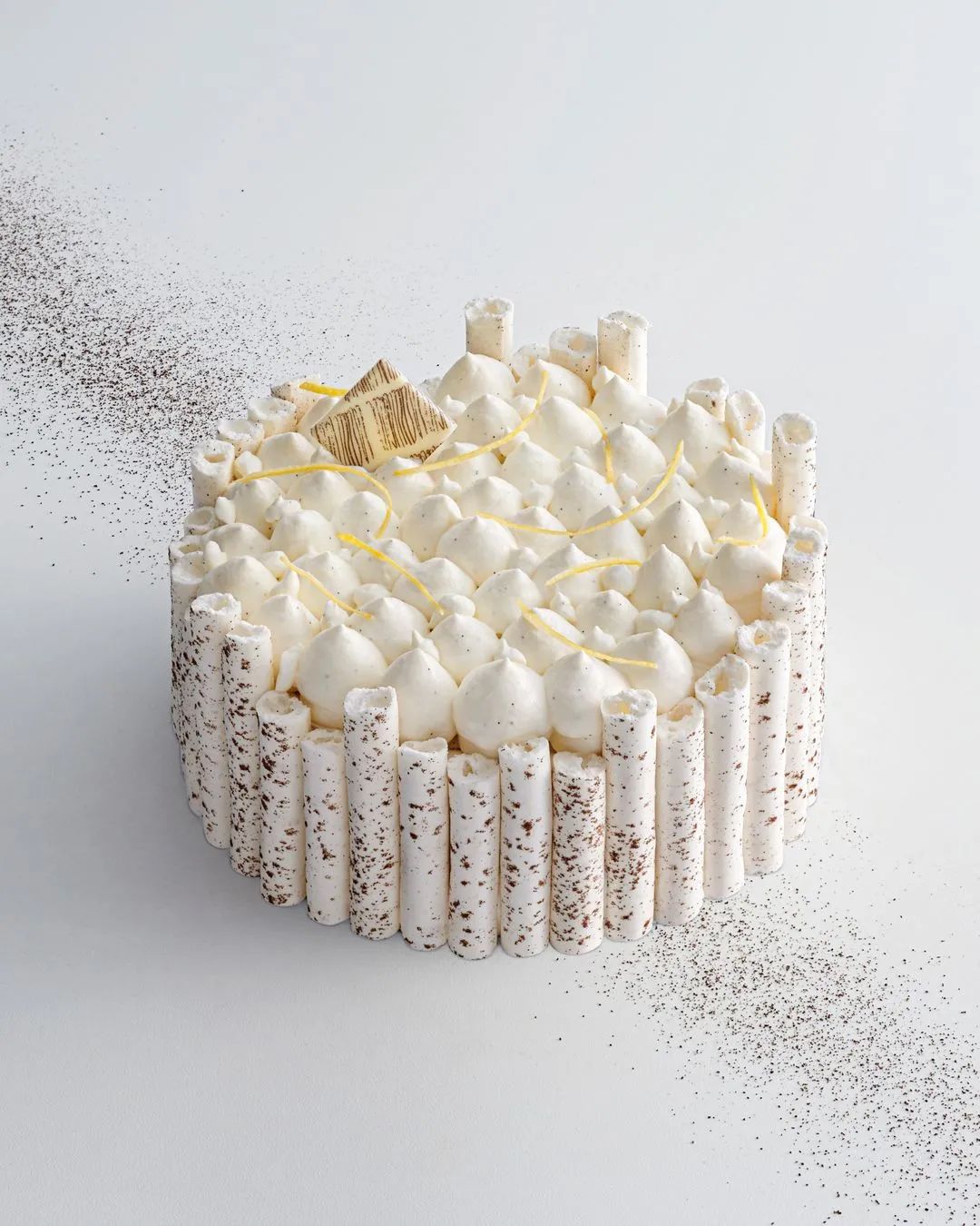 这款冬日氛围感满满的蛋糕中,蛋白霜既充当了装饰品,又增强了风味层次。围上一圈长棍状的蛋白酥皮,参差错落;圆形蛋白酥皮之上挤满香草鲜奶油,也非常爽口轻盈。