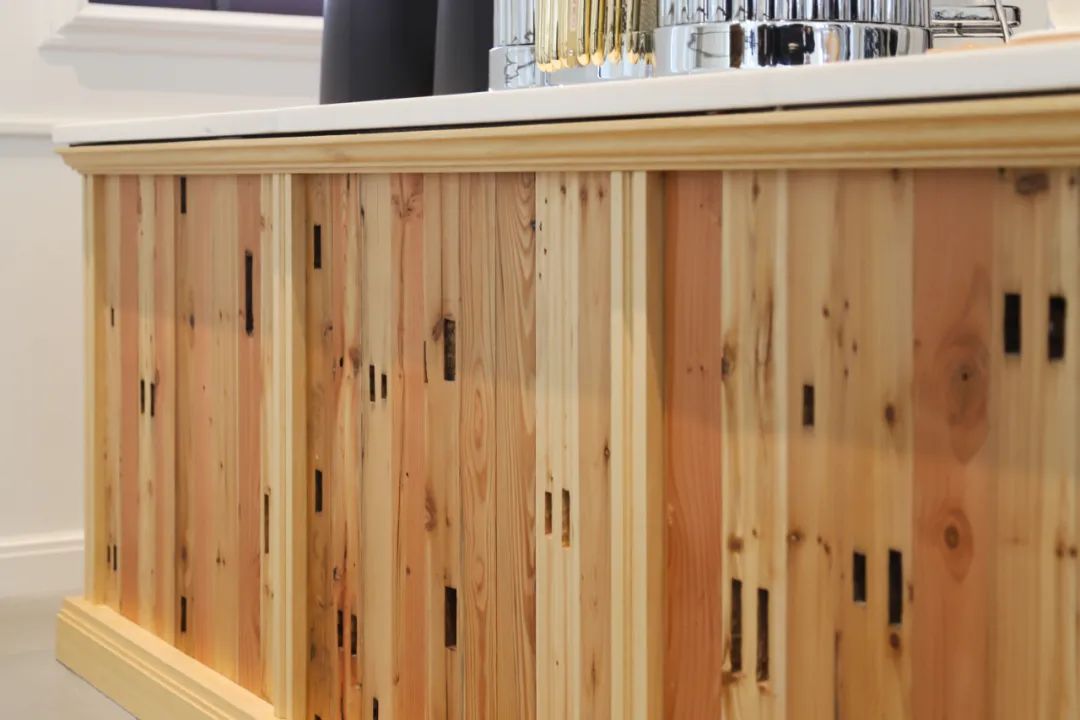 二楼也有一个吧台,外立面上的木头全部来自旧门框和窗框,还保留了原有的榫眼。