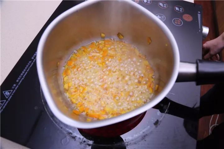 ②细砂糖50g和冷水混合煮开,在糖液中倒入橙皮丁,小火熬煮至糖液基本烧干(此时可以开始做蛋糕,让橙皮在糖液里熬至半透明入味,使用前再过筛滤去糖液)。