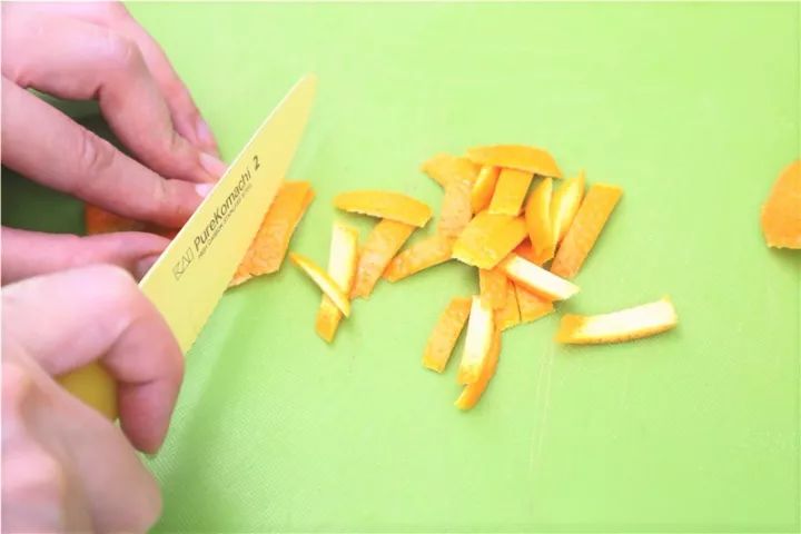 准备工作:以160度预热烤箱,放入一个加了热水的烤盘。制作糖渍橙皮:①削出橙皮,切成小丁,注意取橙皮时,尽量避免取到白色部分,因为白瓤是会有苦味哒!