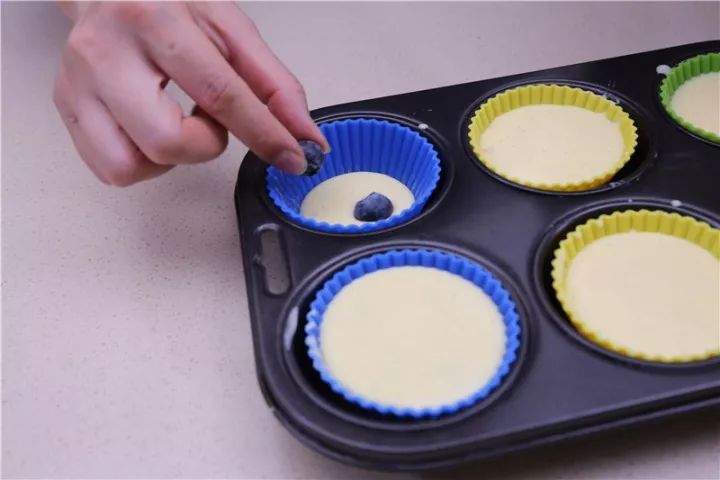 ②把奶酪糊舀入模具中,除了可以做原味,加入糖渍橙皮、适量的整颗蓝莓,还能做出香橙&蓝莓口味!TIP:需注意,蓝莓最好放在面糊内部,如果放在表面,烘烤的时候会爆浆,导致表面产生裂痕~