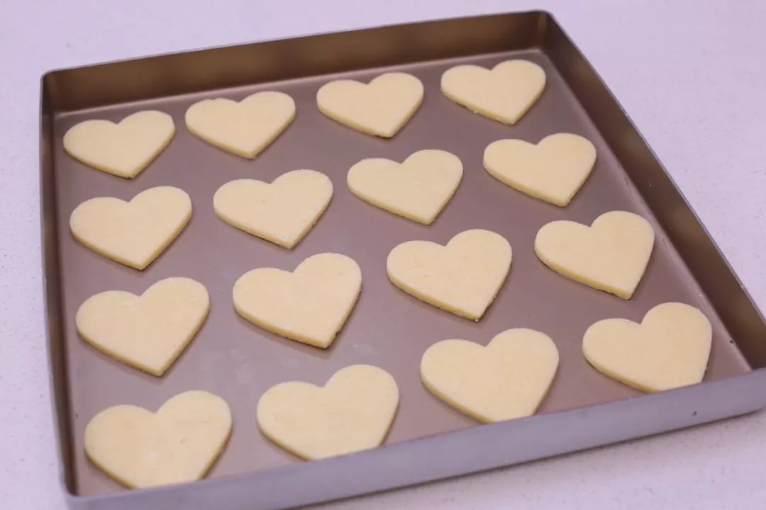 ⑤取出用心形切模刻出形状,摆入烤盘,放进预热好的烤箱中层,上下火170度先烤10分钟至半成熟的程度。