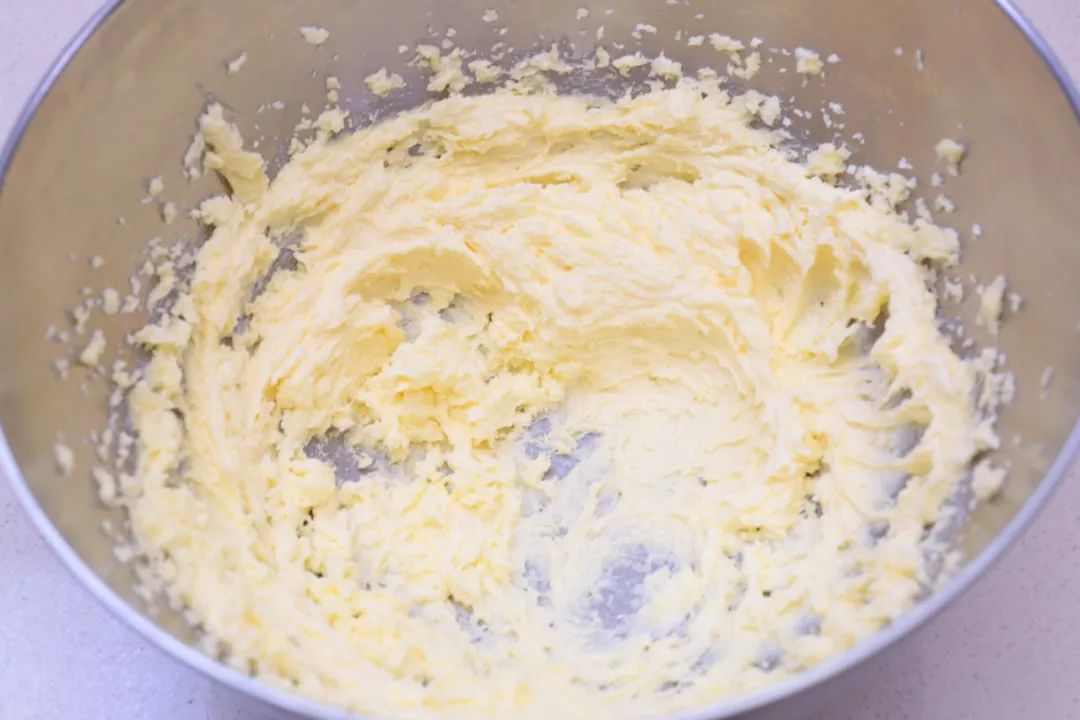 准备工作-黄油放在室温软化制作饼干底:①软化好的黄油加砂糖一起打发,体积变大颜色变白。