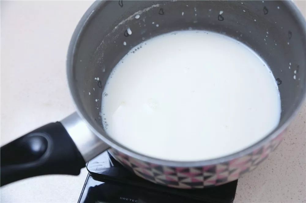 制作牛奶慕斯:①吉利丁片提前放入冰水中泡软。②牛奶加细砂糖加热至完全融化。