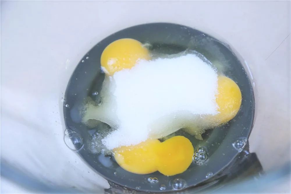 ②全蛋液加细砂糖,用厨师机或电动打蛋器打发至颜色发白、体积明显膨胀。