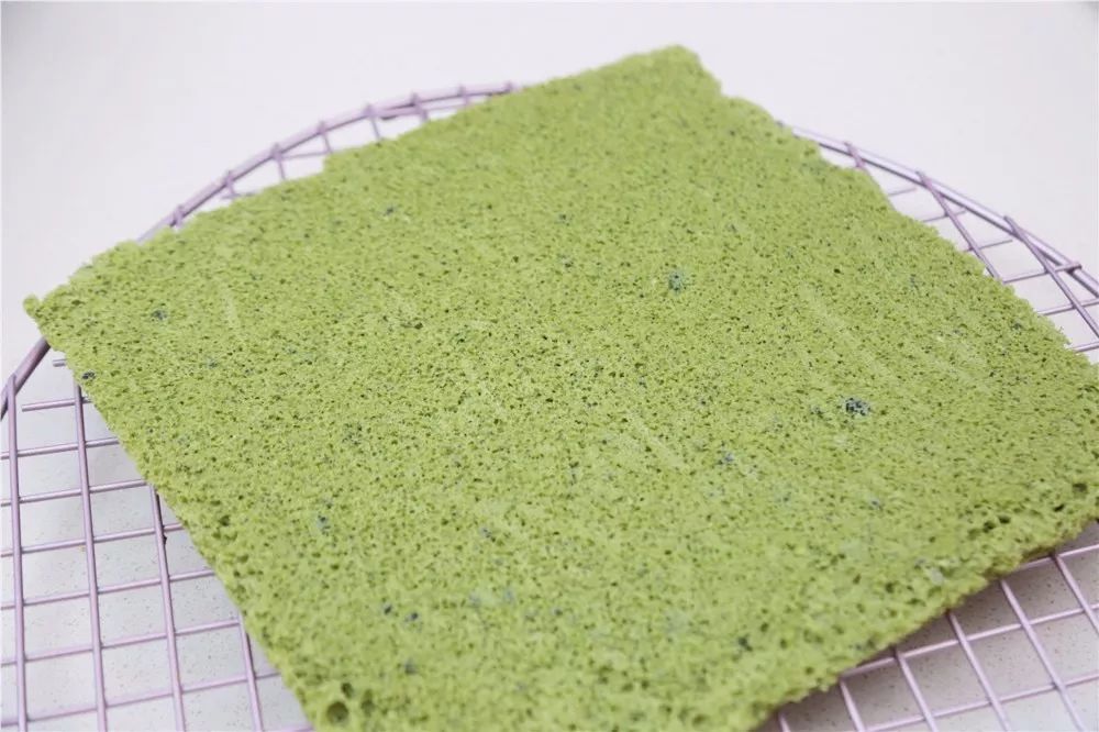 ⑥取出盒子,铺上一层抹茶海绵蛋糕,倒上抹茶慕斯,至9分满,放冰箱冷藏1小时以上凝固。