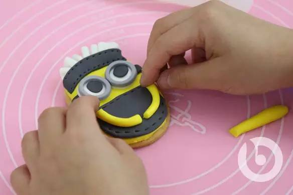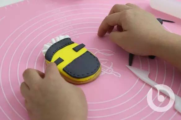 ❶准备好饼干,翻糖硅胶垫,防粘擀面棍,翻糖切刀,饮用水与笔刷,尖头小剪刀,翻糖膏(黄色,黑色,灰色,粉色)裱花嘴