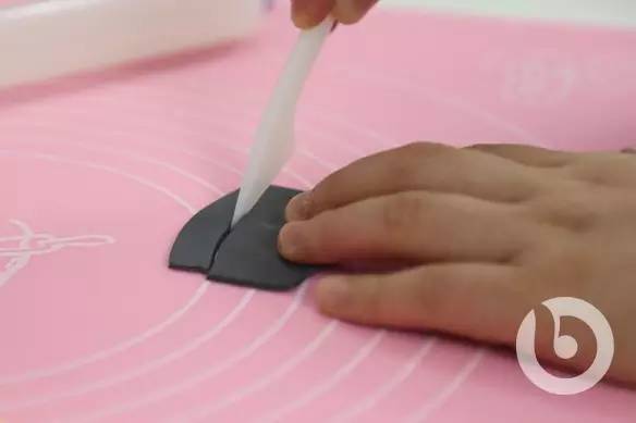 ❹黑色发带,制作出0.5CM宽,5CM长度,0.2CM厚度的黑色发带,贴于翻糖饼干上