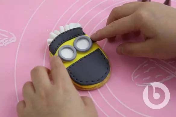 ❻眼睛的制作,把灰色干佩斯赶成0.5CM厚度的糖皮之后用圆形裱花嘴刻出眼镜大小,用白色干佩斯赶成0.2CM厚度,刻出眼睛,用黑色翻糖膏赶成0.2CM厚度刻出眼球。用黑色翻糖膏刻出眼镜的带子,之后刷水,按照,黑色眼镜带子,白色眼白,黑色眼珠,灰色眼镜的顺序贴