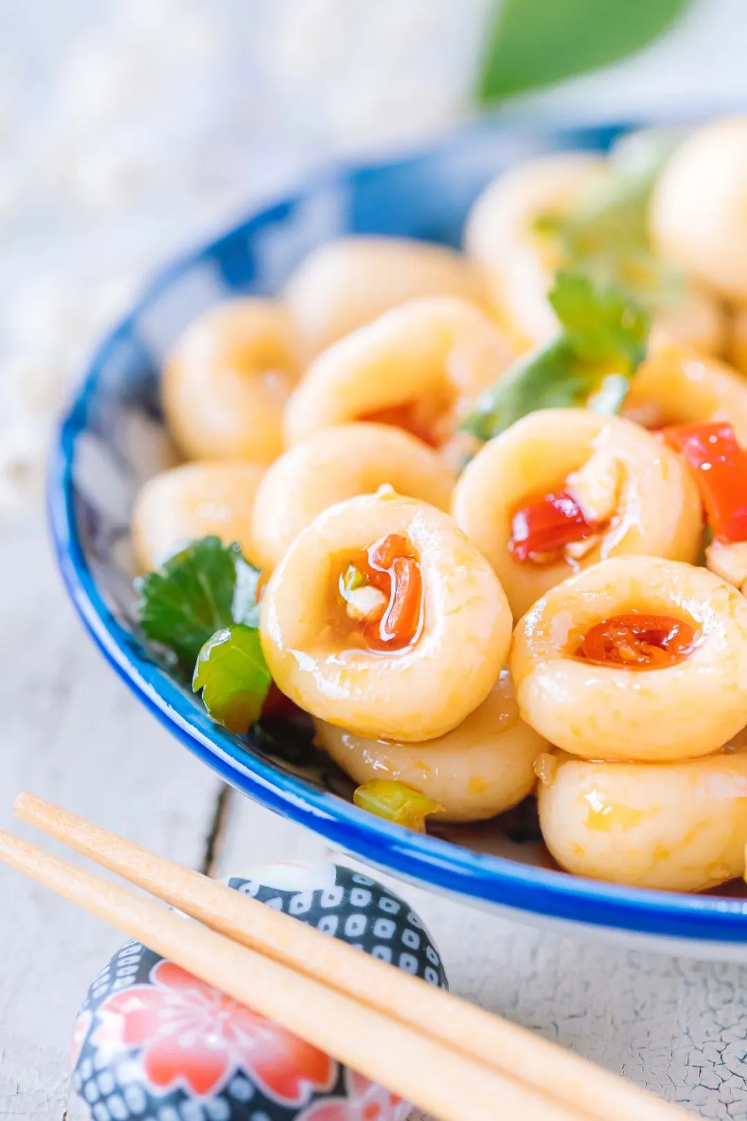 ⑨指天椒切丁,大蒜和香菜切末。在土豆粉中加入所有调料。