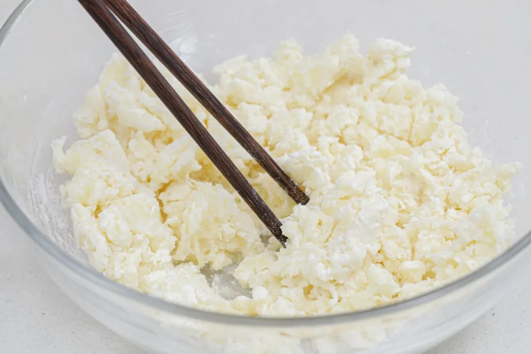 ⑤先用筷子拌成絮状。再用手揉成光滑的面团。
