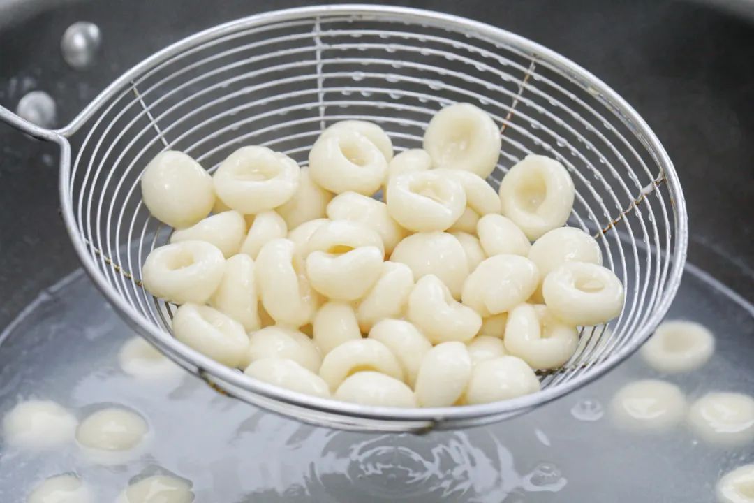 ⑧大火煮至土豆粉浮起后,再煮1分钟至熟透捞出。过一遍冰水,土豆粉口感会更加筋道。