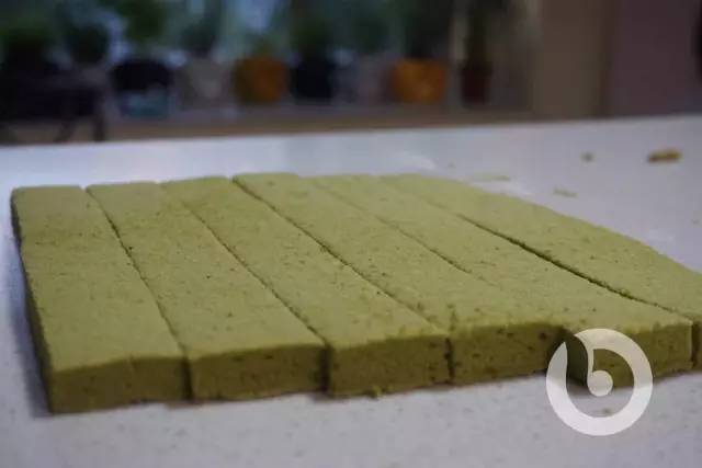 ①将烘焙好的抹茶蛋糕卷切成2厘米宽,8厘米长的长条状。
