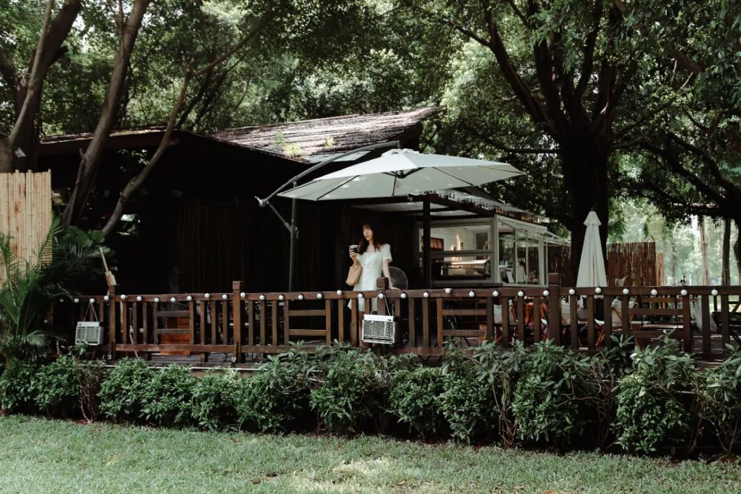 竹子编制成排做外墙,即使是30多度夏天,也能让眼睛到体感保持凉爽。最惊喜的是座位之间生长着一株货真价实的老榕树,风吹过叶片沙沙作响,斑驳的阳光在木桌上欢快跳动,手中的咖啡也注入了灵魂。