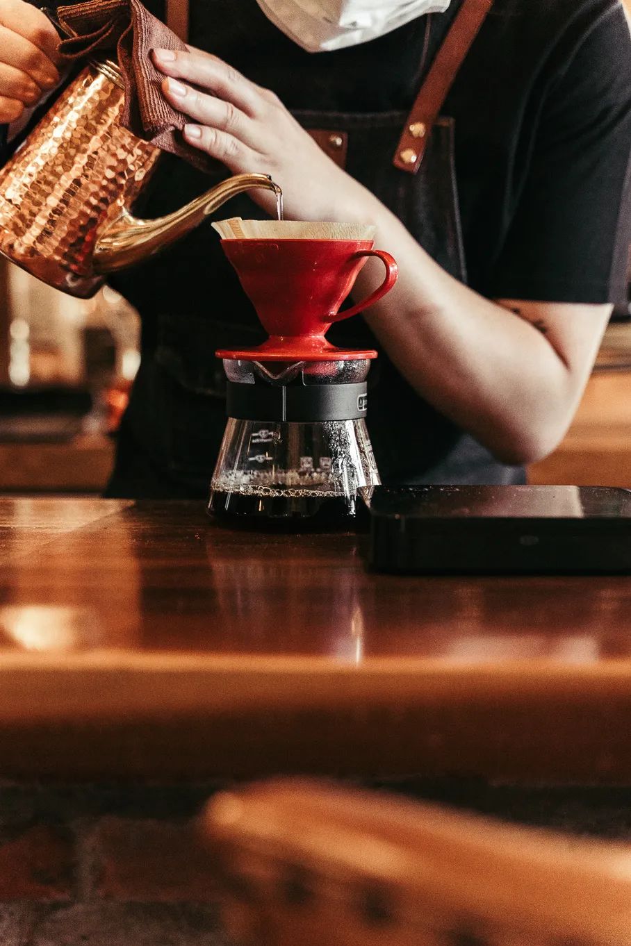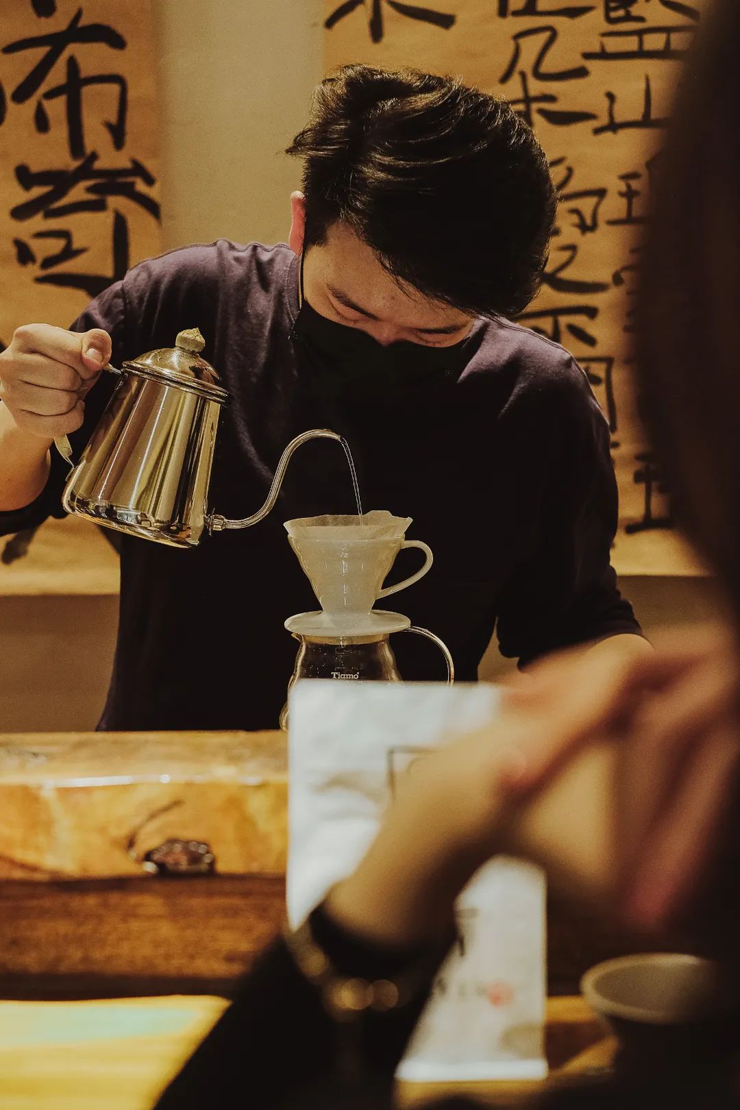 吧台设在了店铺中央,玻璃咖啡豆罐、叠纹手冲滤杯、器具统一配色,处处都透露着精致。这里的咖啡品类丰富,意式、手冲、特调都能够得喝到。
