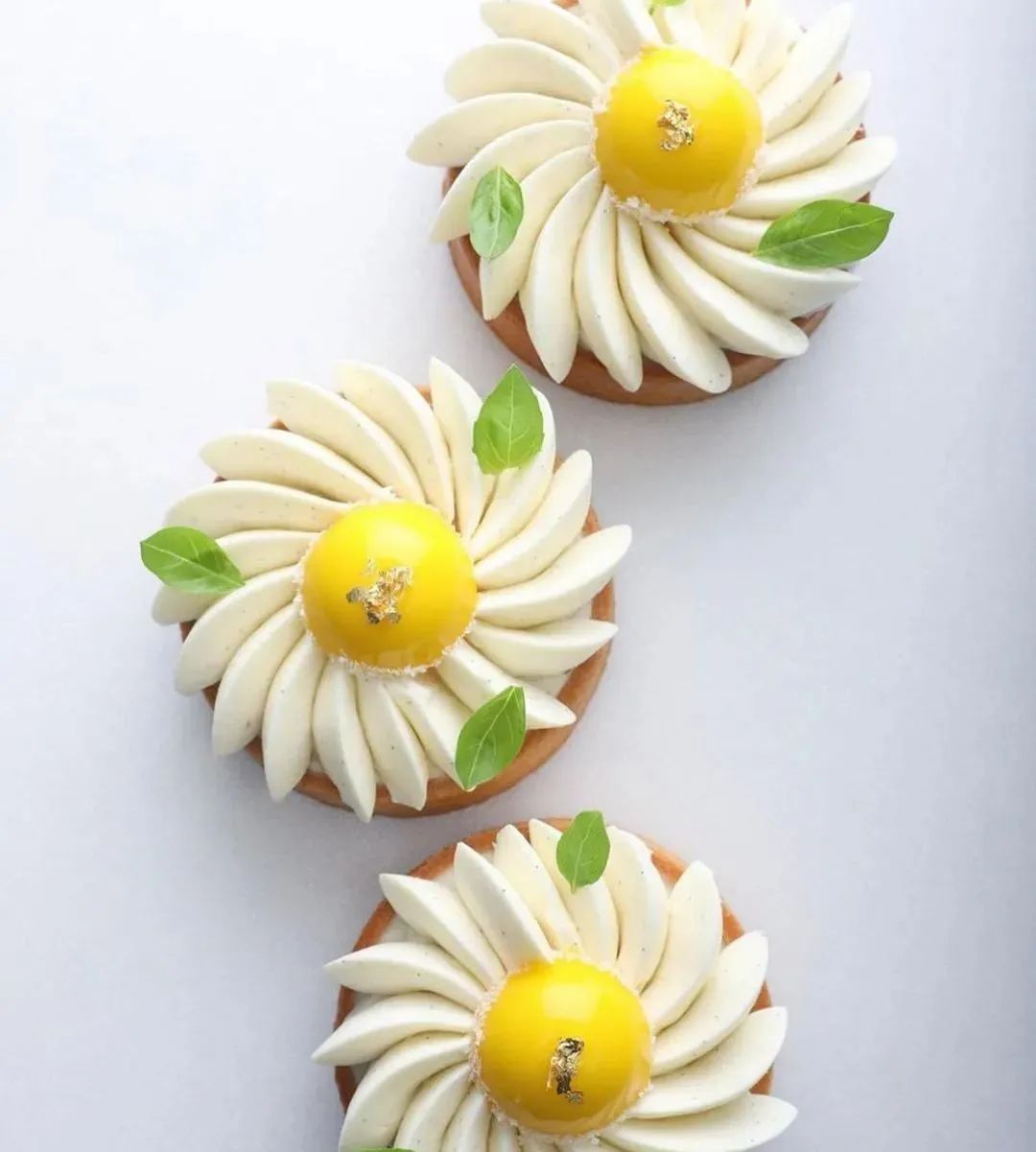 YUZU & LEMON BERBENA GEL 52 g water151 g yuzu juice 41 g sugar3.7 g agar-agar2.5 g lemon verbenaprocedure:1.In a saucepan, heat water and yuzu juice, when the temperature reaches 45℃, stir in previously mixed sugar and agar-agar mixture and heat until it boils.2.Remove to a bowl and store in fridge to set.3.Add lemon verbena leaves and mix using a hand blender until the mixture turns into a soft gel.GLAZE371 g yuzu juice 45 g sugar 10 g pectin NH 74 g corn syrup qs g gardenia powderprocedure:1.In a saucepan,heat yuzu juice and a pinch of gardenia powder to 45℃.2.Stir in previously mixed pectin NH and sugar mixture.3.Add corn syrup and heat until the mixture boils.4.To use, set the glaze to 65℃, and mix thoroughly a using hand blender.YUZU WHIPPED CREAM150 g fresh cream #1113 g yuzu juice 27 g gelatin mass (1:5)136 g white chocolate (Ivoire 35%)347 g fresh cream #2 procedure:1.Stir gelatin mass into fresh cream #1 heated until just before boiling.2.Pour 17 over white chocolate melted to 35℃. Mix using a hand blender.3.Add fresh cream #2 warmed to 35℃, then yuzu juice in order. Continue to mix using hand blender.4.Rest in fridge for 12 hours. Whip to use.CRYSTAL SPRAY GUN MIXTURE150 g Absolu Cristal glaze 50 g waterprocedure:1.Prepare Absolu Cristal glaze and water.2.Heat in a saucepan.3.When Absolu Cristal glaze in completely dissolved, sieve and sue at 80℃.ASSEMBLY & DECCORATIonqs g coconut powderqs g lemon verbena leavesqs g edible gold leavesprocedure:1.Brush yuzu syrup on lemon verbena biscuits.2.In each 100% baked tarte shells, pipe 15 g of yuzu & lemon verbena gel.3.Place lemon verbena biscuits soaked with syrup on top of yuzu & lemon verbena gel, and lightly press with a flat tool.4.Fill with yuzu cream completely, and even out the surface using a spatula. Freeze completely.5.Pipe yuzu whipped cream using a St. Honore nozzle (#15) and freeze completely.6.Spray crystal spray gun mixture on the surface of the frozen yuzu whipped cream.7.Remove the frozen half-sphere yuzu cream from the molds. Glaze the frozen cream.8.Coat the bottom edge with coconut powder and place on the center of the tartes.9.Decorate with lemon verbena leaves and edible gold leaves to finish.表走开,看彩蛋哦~—▼传送门 · 戳下图·有配方▼—关注“世界烘焙配方”sjhbpf进入世界顶级烘焙殿堂!全球最新烘焙资料、最炫蛋糕图片、最时尚面包大师作品,全球名店产品展示,最详尽的配方食谱!点击阅读原文,传送至下载链接(百度云盘)转载请标注:转自微信公众号:世界烘焙配方戳一下在看嘛~你又不会怀孕! 预览时标签不可点