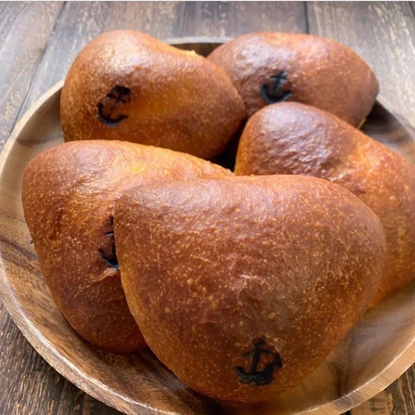 《明太子面包》:在有嚼劲的面团中,搭配自制的明太子酱,咸度适中,又因为特别定制的小尺寸,很适合解馋。