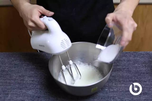 ④接下来制作蛋白霜,将蛋白倒入到无油无水的打蛋盆中,中低速搅打至蛋白呈现细腻泡沫的状态,加入1/3的细砂糖