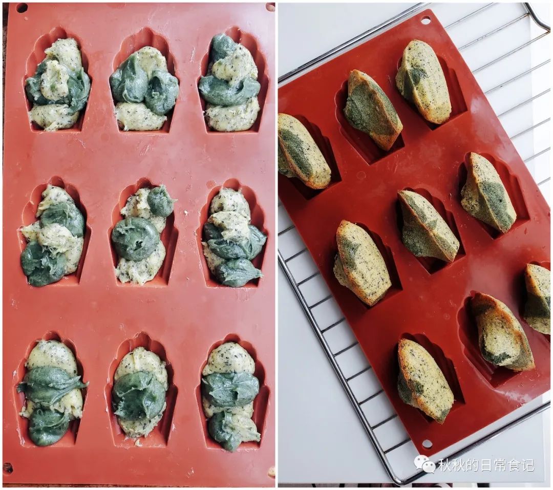 ③玛德琳模具内涂抹一层黄油,两种面糊随意交替着舀入模具,约九成满。放入预热至180摄氏度的烤箱,中层烤12分钟左右直到玛德琳长出大肚子,边缘颜色变深。稍冷却后脱模。
