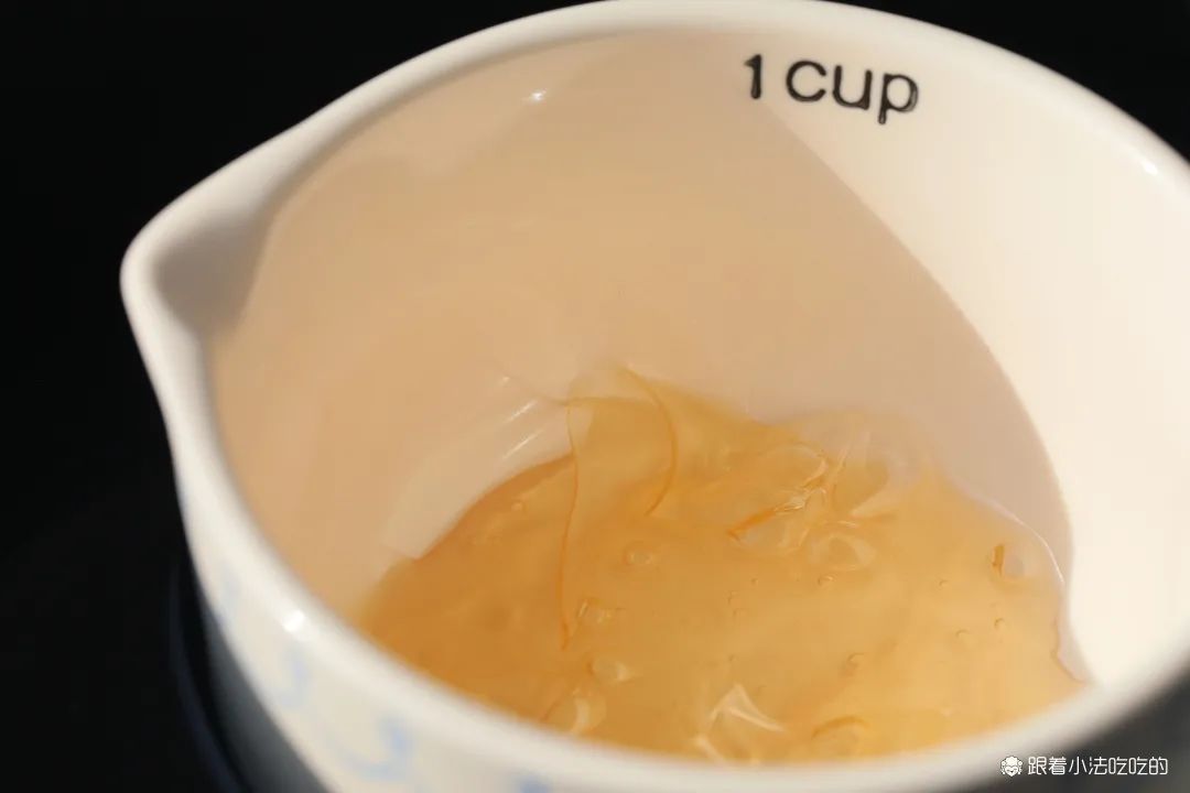 ③做好的卡仕达酱盖保鲜膜冰箱冷藏晾凉,加入淡奶油和细砂糖打发均匀,吉利丁片隔水融化加入迅速拌匀,完成卡士达奶油。
