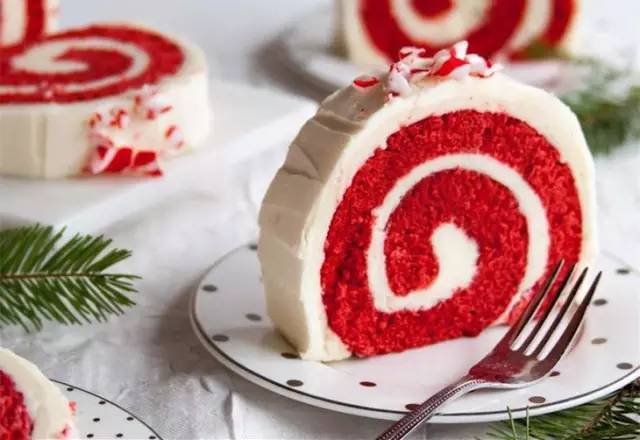 ①烤箱预热175度,烤盘铺好烘焙油纸,低粉、可可粉、泡打粉、小苏打、盐过筛混合备用②蛋液加入细砂糖中高速打发5分钟,至体积膨胀颜色发白。调至中低速,加入黄油、香草精、酪乳、白醋和红色色素搅拌③搅拌均匀后筛入一半的混合干性材料,低速搅拌直至充分混合,再加入另一半继续搅拌直至混合均匀④将面糊倒入烤盘内,表面刮平,放入预热好的烤箱175度烘烤12-15分钟⑤蛋糕体出炉后抬起油纸边,翻转倒扣在一块事先准备好的干净餐巾(没有可用一张干净的油纸代替)上,撕去油纸,表面筛糖粉⑥沿着蛋糕体短边,用餐巾趁热卷起固定好,晾至室温⑦等待晾凉过程中,开始制作奶油霜。蛋白中加入细砂糖搅拌均匀后,将打蛋盆坐入热水锅中隔水加热,煮至150度离火⑧高速搅打蛋白液直至盆边恢复室温,加入剩余材料(黄油、白巧克力、香草精、薄荷精)中高速搅打至顺滑⑨将毛巾取下,蛋糕体表面均匀涂抹一层奶油霜,再次小心卷起,剩余奶油霜可以涂抹在表面做装饰