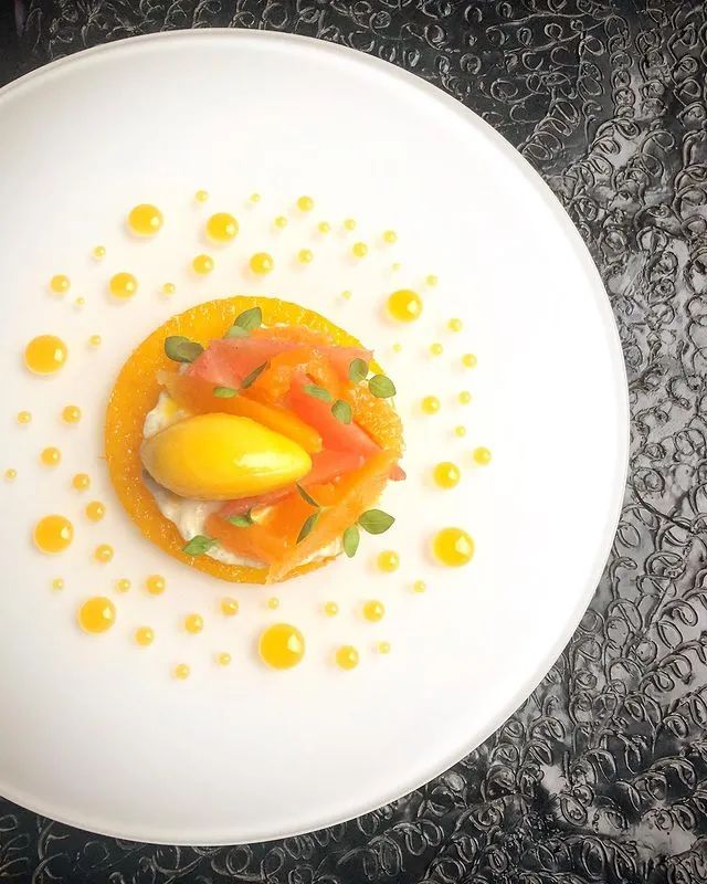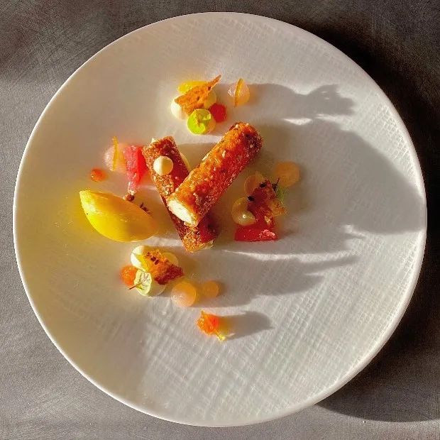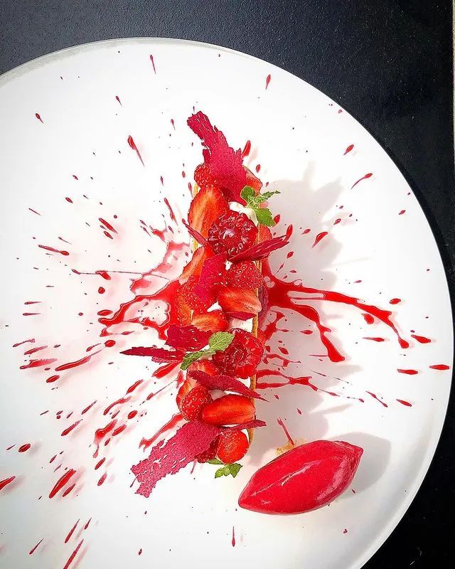 °清甜的梨可以加入伯爵茶提香,加入橄榄酱汁增加咸味,塑造更多样的口味对比。°酸樱桃与迷迭香为主体的搭配,添上了红紫苏与梅酒的酱汁,丰富了醉人的层次。……当然,由于盘式甜点现制现吃的特点,发挥的空间其实很大,冷热组合带来的口感变化或是稍纵即逝的点缀性的观赏设计,都能令食客感受到一场口味盛宴。02视觉考量在确定了大致甜点的轮廓后,关于配色、形状、大小、容器等诸多要素,也是构成整体视觉效果的很重要的一环。同时也需要考虑到摆盘时的先后顺序。// 鲜艳的颜色更抓眼球一般选用绿、红、黄、白、粽、黑等多种不同色系来打造缤纷的视觉效果。同时多色比单色更出彩。
