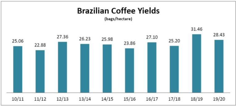USDA还将今年度巴西咖啡亩产量下调至28.43袋/公顷,相比此前预计值减少了1%。究其原因在于价格的下跌导致咖农对于种植管理(如除草剂,农药和化肥)使用的减少。此外,天气原因也导致了亩产量的下降。