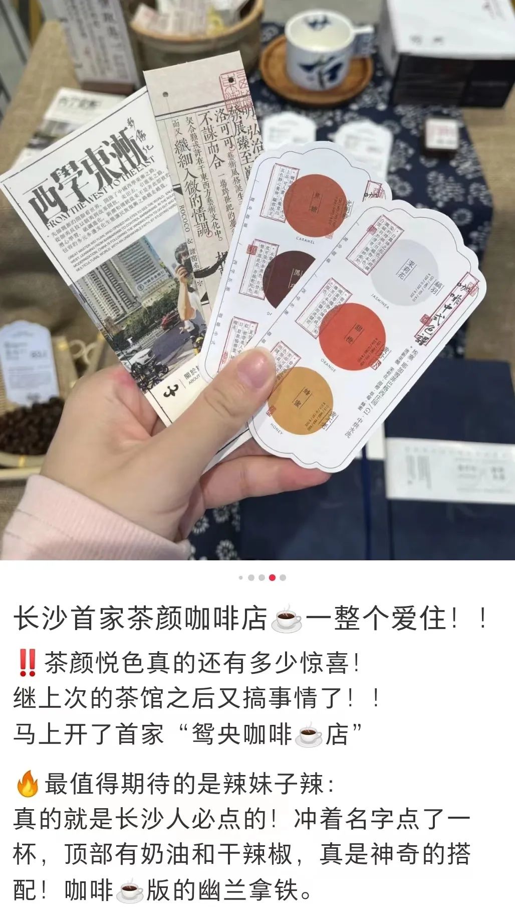 小红书上的打卡///据了解,目前这5家鸳央咖啡仅长沙独有。其中4家为普标水吧店型,而印象汇东南角店为主题店型,面积稍大,有堂食座位。对于鸳央咖啡是否会扩张,是否会随着茶颜悦色去到长沙以外的城市,鸳央咖啡相关负责人表示,目前还在测试调整当中,“暂时不会开到省外去,现阶段我们还是会先做好鸳央咖啡的品质和服务,等到我们成长多一点的时候,我们再做更详尽的打算。”· ARTICLE文章刘滢EDITOR编辑三月DESIGN设计啊存REVIEW复核阿鲁