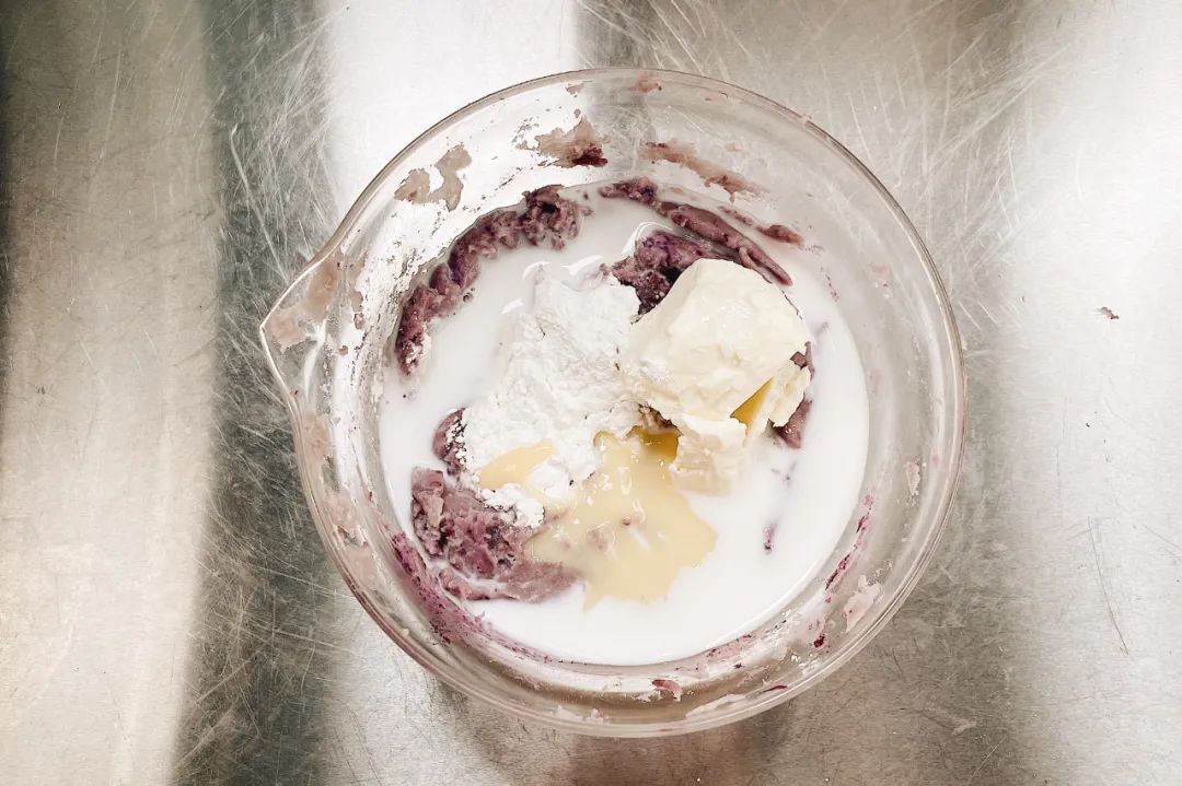 ④芋头紫薯加入40G牛奶、15G炼乳、20G奶油奶酪和12G玉米淀粉搅拌均匀,喜欢细腻口感的也可以用搅拌机搅拌。