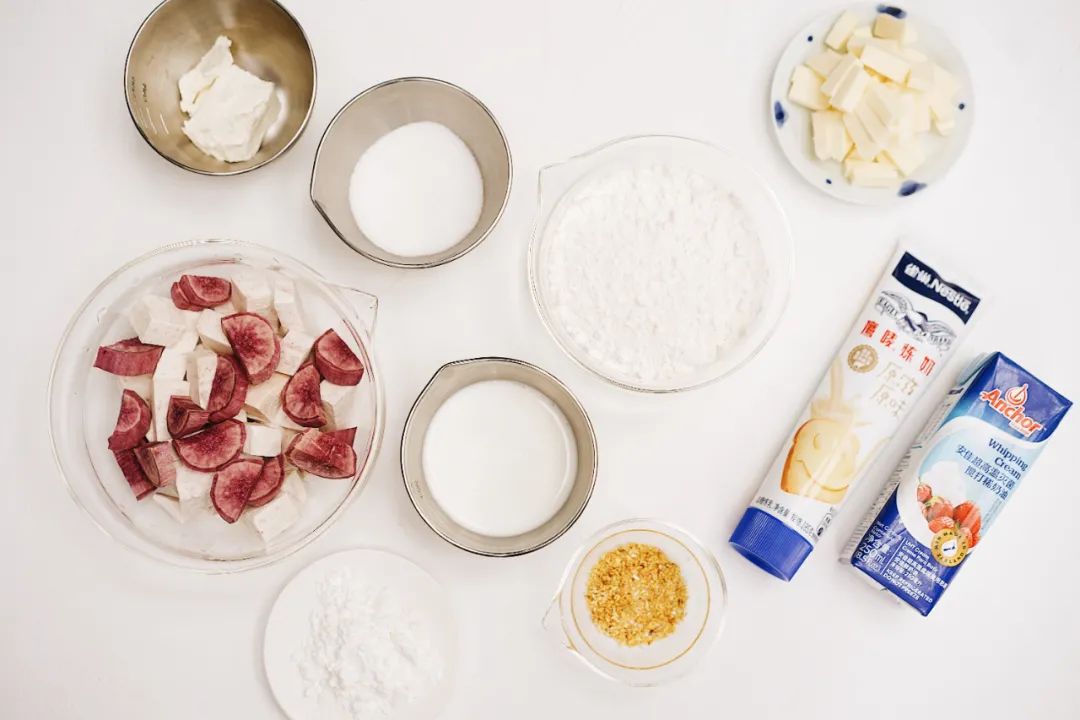 参考量:6寸(8寸用量需要增加一倍)挞皮美枚低筋小麦粉120G白糖30G黄油(室温软化)60G牛奶35G芋泥奶酪馅荔浦芋头120G紫薯30G牛奶40G炼乳15G奶油奶酪20G玉米淀粉12G桂花奶油淡奶油100G白砂糖8G酒酿2大勺