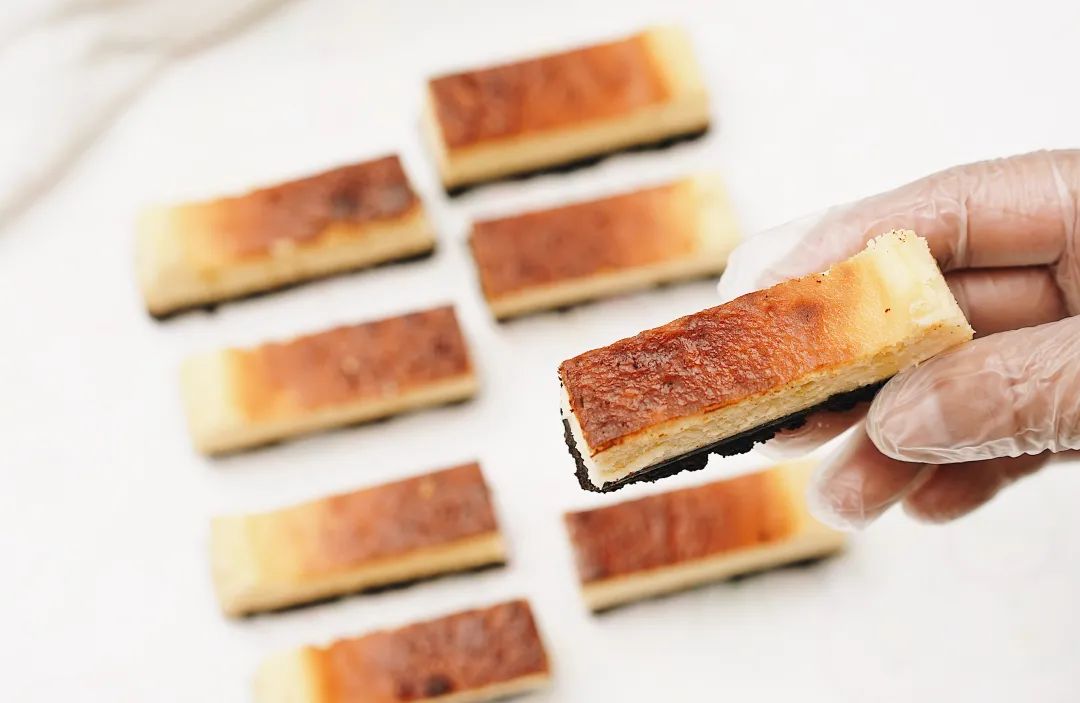 ⑥芝士面糊挤进模具中,震出气泡,用刮刀刮平表面。放进烤箱先180度烘烤20分钟,再转200度烘烤10分钟,最后两分钟开热风。要注意芝士的上色程度,有少量的焦斑更好看也更有食欲。