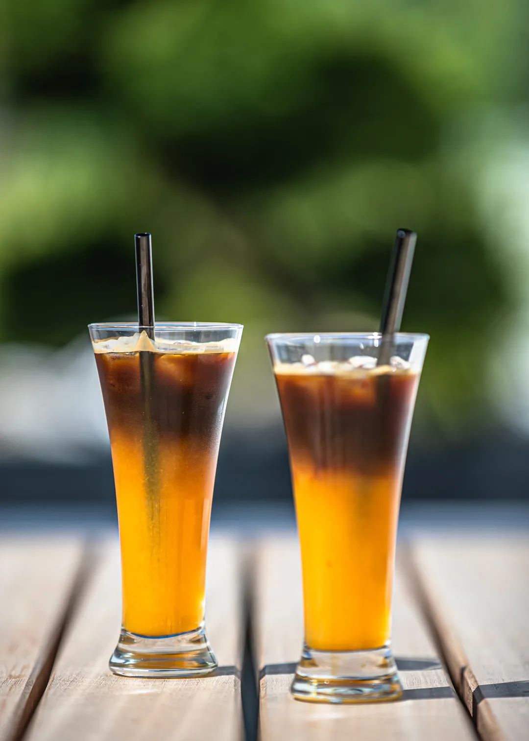 ●原料(4杯量):3个新鲜百香果,8 shots浓缩咖啡,牛奶●步骤:萃取4个双份浓缩,和百香果汁摇匀后倒入高脚杯;牛奶加入少量糖摇成奶沫;再将奶沫淋在咖啡液面上,最后用咖啡粉点缀。百香果独特而迷人的香气,在抚平燥热上天赋异禀。透过云朵般轻盈的奶沫,尝一口果香萦绕的咖啡,这就是“沁人心脾”的含义吧。#06Japanese Cold Brew