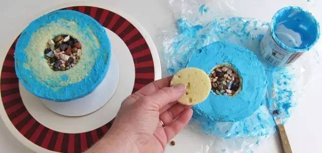 装饰①将少量黄油霜调成蓝色,抹在蛋糕上边,将两个半球拼在一起