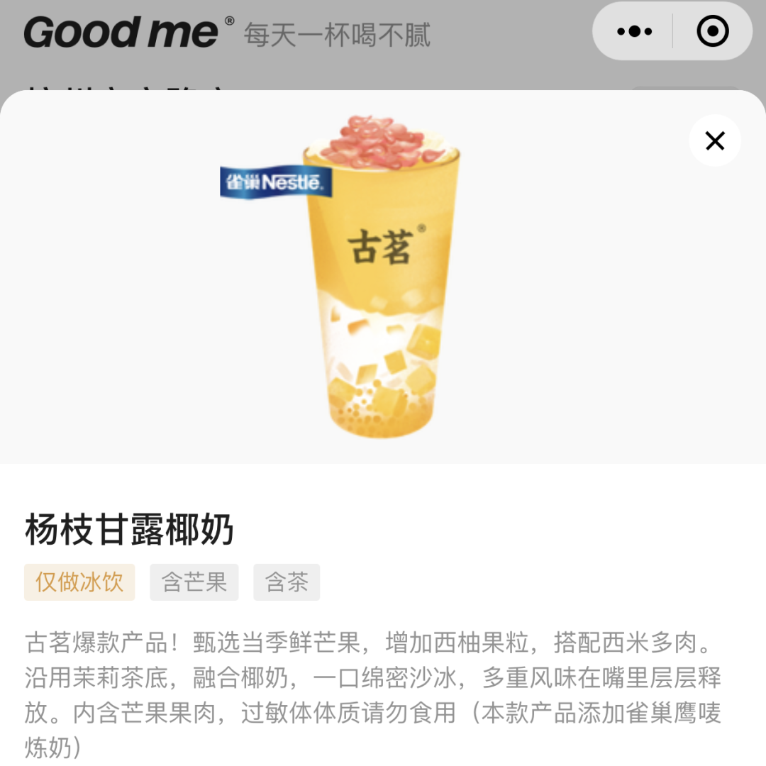 杨枝甘露虽经典,但古茗口感丝滑、质地温柔的这一杯还是惊艳了味蕾。融入了雀巢鹰唛炼奶便是其中的点睛一笔。