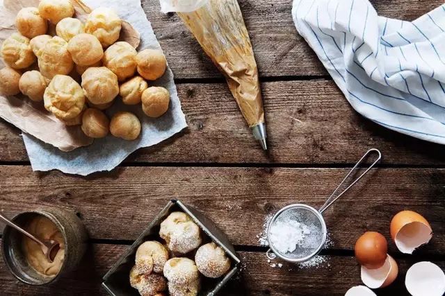 ④放入预热至165度的烤箱中,烘烤30-40分钟。烤好的泡芙表面成棕色,内心中空。