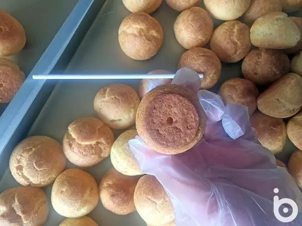 ⑤烤好的泡芙底部戳一个小洞,把卡仕达奶油酱挤入泡芙内部填满。