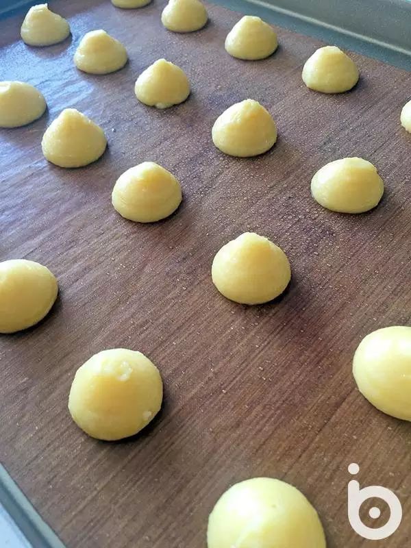 ③泡芙面糊装入裱花袋里(内装有1cm直径的裱花嘴),在烤盘里挤出直径2.5厘米的面糊,最后在挤好的面糊上刷少许蛋液。