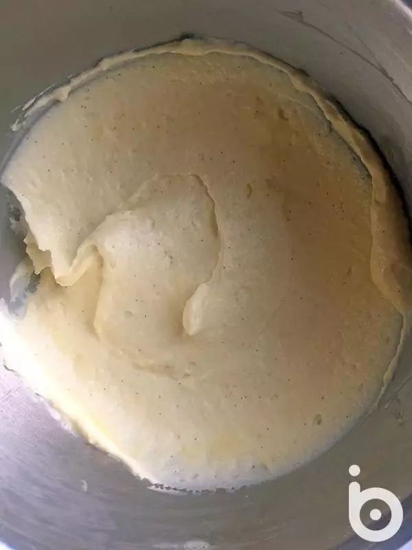 ②把面团倒入另一个盆内继续翻拌,让热气散去温度降到55度左右,开始分多次少量的加入蛋液(全蛋加香草精混合均匀即可),每加一次鸡蛋,都要用刮刀搅拌至完全吸收后,再加入下一次蛋液,最后的蛋液要根据面糊的稠稀度进行调节,正确的面糊状态为,提起刮刀,上面的面糊呈倒三角的状态即可。