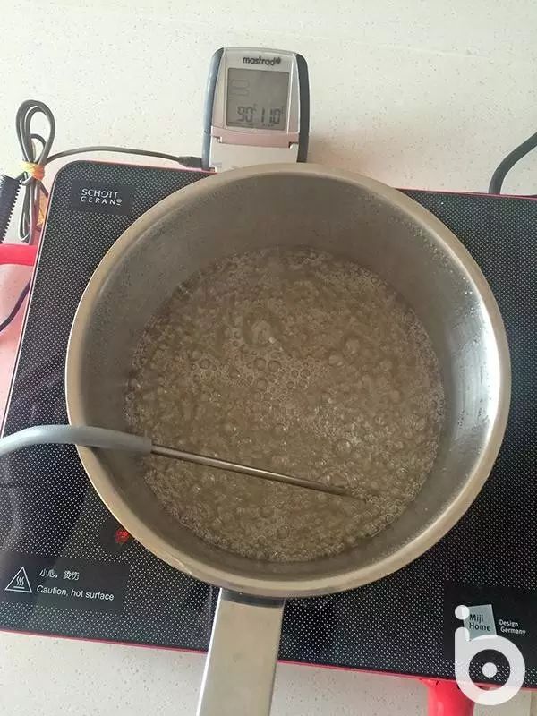 ②B全部放入盆内搅拌均匀,把煮开的牛奶(即步骤①做好的混合物)少量加入并不断搅拌,加完一半牛奶的量后,倒回锅内和牛奶混合,开火边加热边不断搅拌,直到感觉混合物开始变浓稠,锅边开始冒气泡。