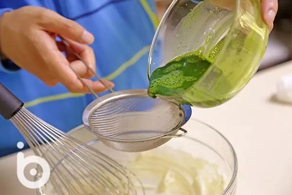 ③吉利丁片用冷水泡软,隔水(微波)融化后加入到步骤②的抹茶液中,用蛋抽混合拌匀