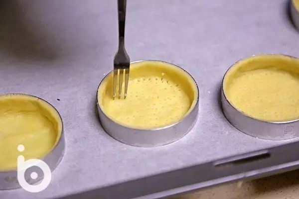 ⑤操作台上轻扑少许低粉(配方份额外),将松弛好的面团取出,擀成厚约2-3mm的面片,填入模具之中,用手指将面片压实,削去多余的面片,送入冰箱冷藏松弛约30分钟⑥用叉子在挞皮底部插出一些小洞,垫好油纸后撒上适量烘焙石子,防止挞皮在烘烤时受热鼓包
