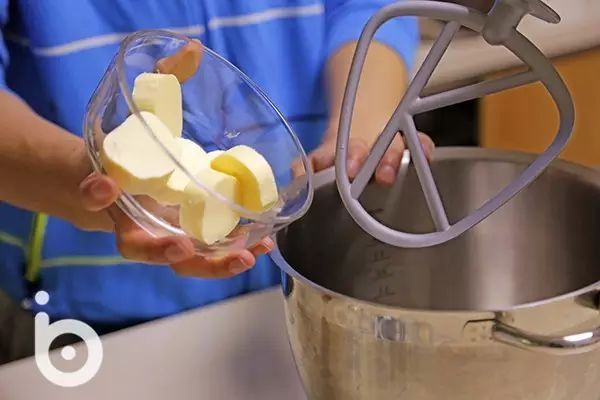 ②将打散的全蛋液分次加入到步骤①的黄油之中,将二者混合打匀(冷黄油可和蛋液不太好混合,就算有一些没有混合也没有关系),备用