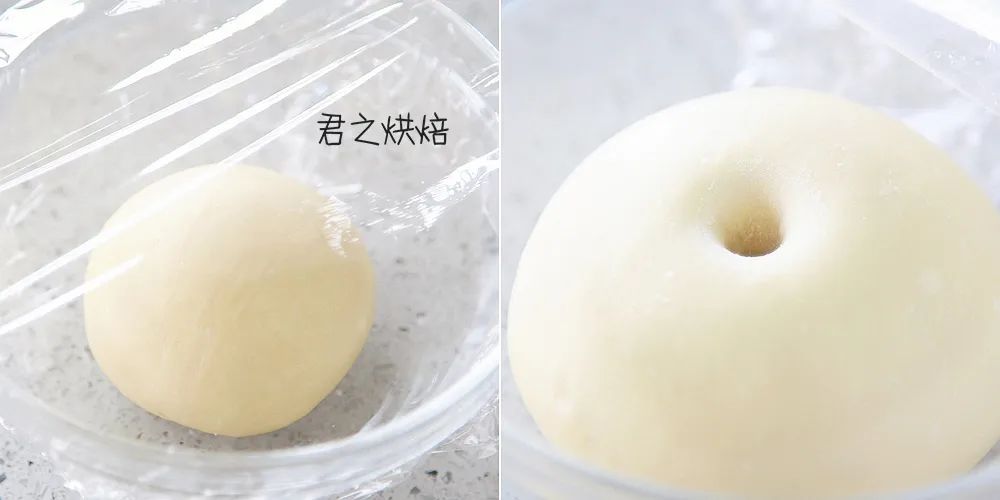 揉好的面团,放入碗里,盖上保鲜膜在室温(25℃)下进行第一次发酵。发酵到面团变到2-2.5倍大,手指沾面粉慢慢捅进去再拔出来,洞口不会回缩也不会塌陷,就发酵好了。