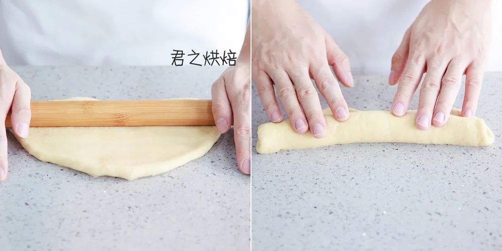 发酵好的面团,用手压扁,排出空气,盖上保鲜膜松弛醒发15分钟以后,在台面上擀开成为长方形面片。擀开后,从一头向另一头卷起,卷成一个长条。